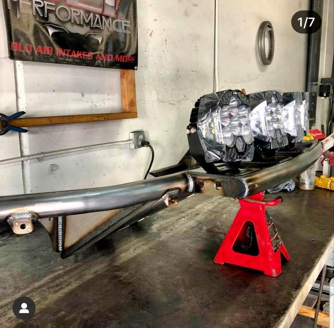 Frame horn cut bumper bolts to steering rack, front frame horns, and front body mount. Increases approach angles, clean tight finish, for the Off-Road look and performance.